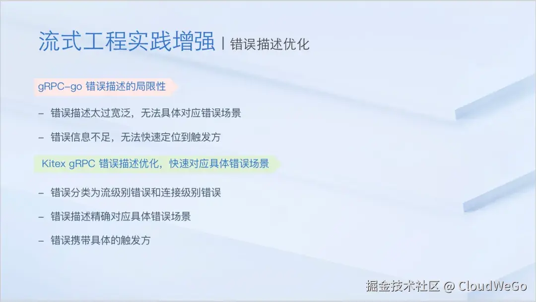 - gRPC-Go 接口设计的局限性:Server 侧流式 Handler 未直接暴露 context 参数,需通过 Stream.Context () 获取;Stream 的 Recv、Send 方法也未暴露 context 参数,无法细粒度控制超时等逻辑。虽然 gRPC-Go 官方认可统一 context 设计,但未计划推出 v2 接口优化,Kitex gRPC 因遵循该设计也存在相同问题。