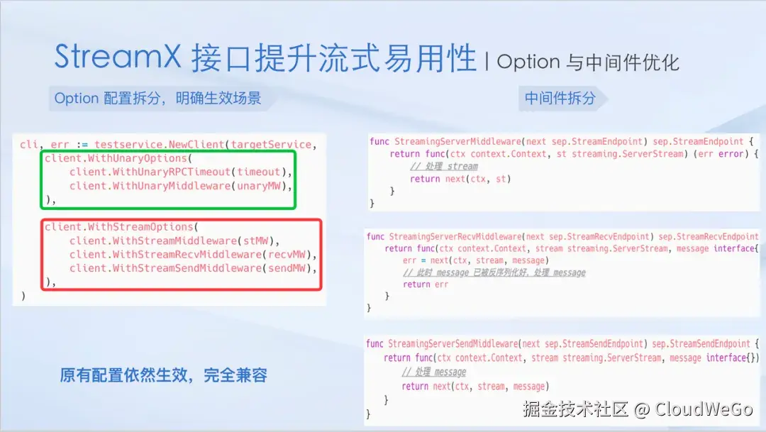 - 统一 context 设计:Server 侧 Unary 接口与流式接口一致暴露 context 参数,Stream 对象的 Recv、Send 方法也新增 context 参数,支持细粒度控制(如超时设置),符合用户使用直觉。