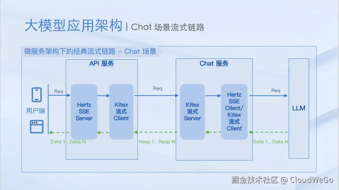 在微服务架构中,基于 Kitex 与 Hertz 的大模型应用链路具备清晰的逻辑架构,以经典 Chat 场景为例,API 服务、Chat 服务与 LLM 通过流式接口实现串联,最终达成一问多答的交互效果: