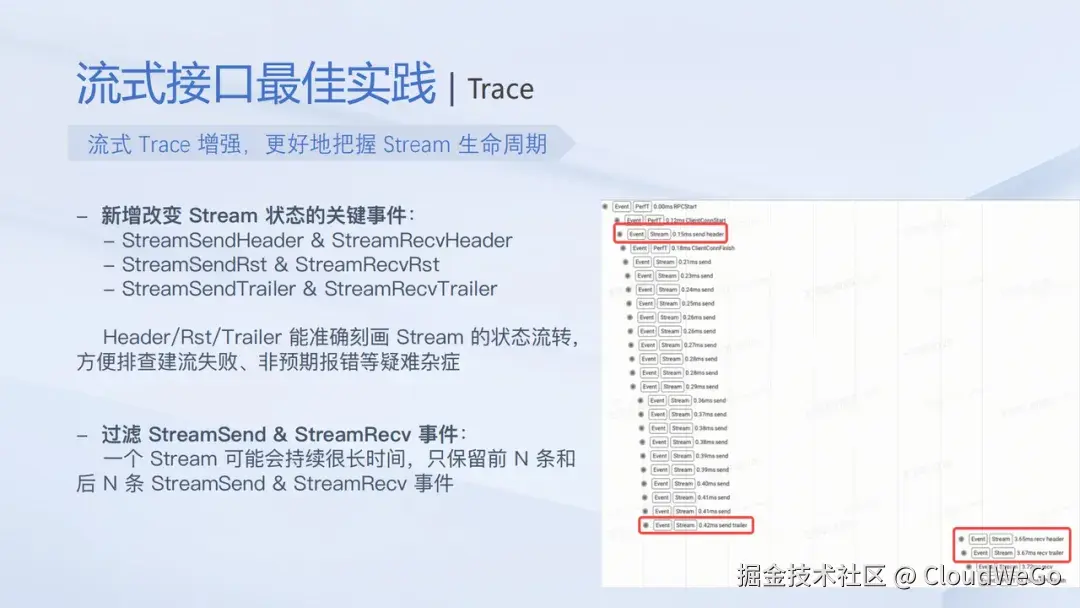 - 增强流式Trace 能力:新增 StreamSendHeader/StreamRecvHeader、StreamSendRst/StreamRecvRst、StreamSendTrailer/StreamRecvTrailer 等关键状态事件,清晰刻画 Stream 状态流转,为建流失败、非预期报错等疑难问题提供排查依据。