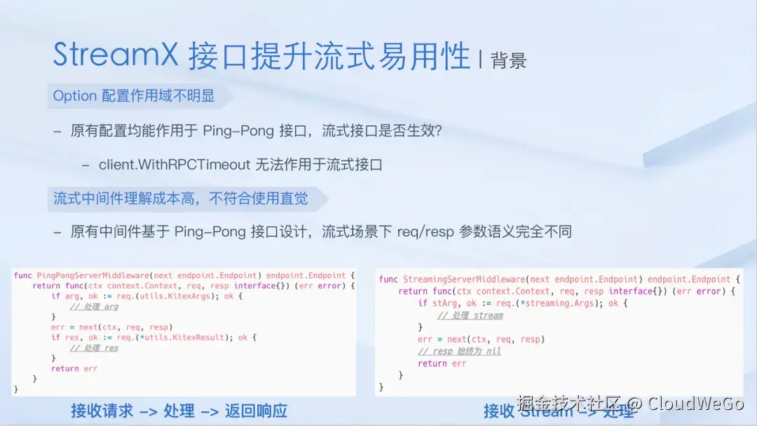 - Kitex 自身能力透出的适配问题:Kitex 最初基于 Ping-Pong 模型设计,未充分考虑流式接口需求。一方面 Options 配置作用域模糊,部分配置仅对 Unary 接口生效,需用户在实践中探索确认;另一方面,中间件只适配 Unary 接口语义(接收请求→处理→返回响应),流式场景中 resp 始终为 nil,语义差异增加理解成本,导致流式接口未能得到完全支持。