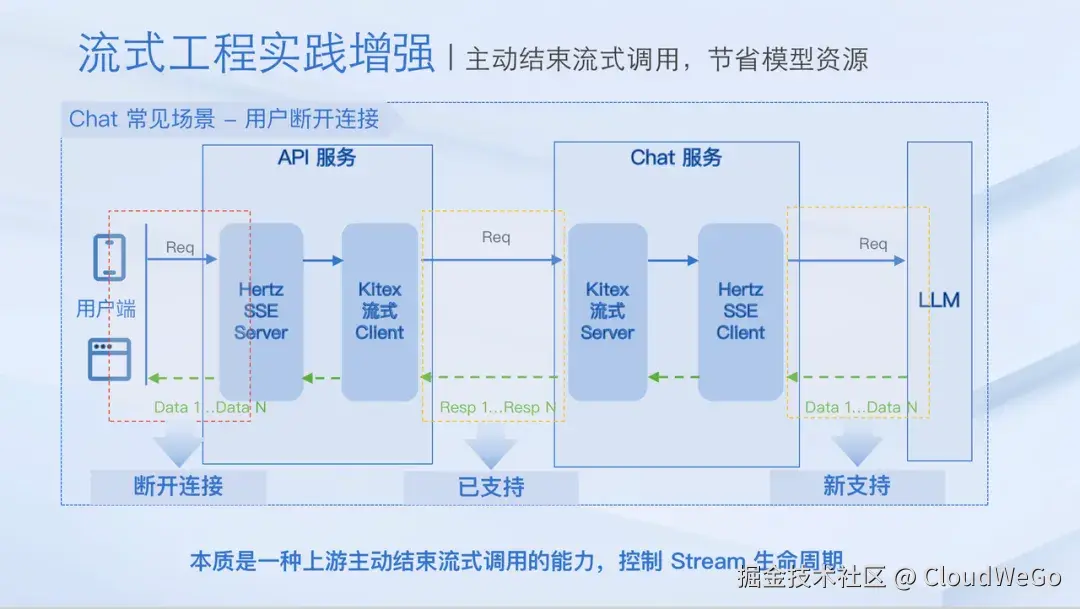 实际场景中可能会因为用户中途修改 Prompt 终止会话、响应超时导致用户放弃、网络不稳定引发连接断开等因素导致会话中断。及时感知并终止无效会话,能有效节省 LLM 资源。对此,Kitex 与 Hertz 的流式接口通过实现统一的 golang context cancel 语义,达成 Stream 生命周期的精准控制: