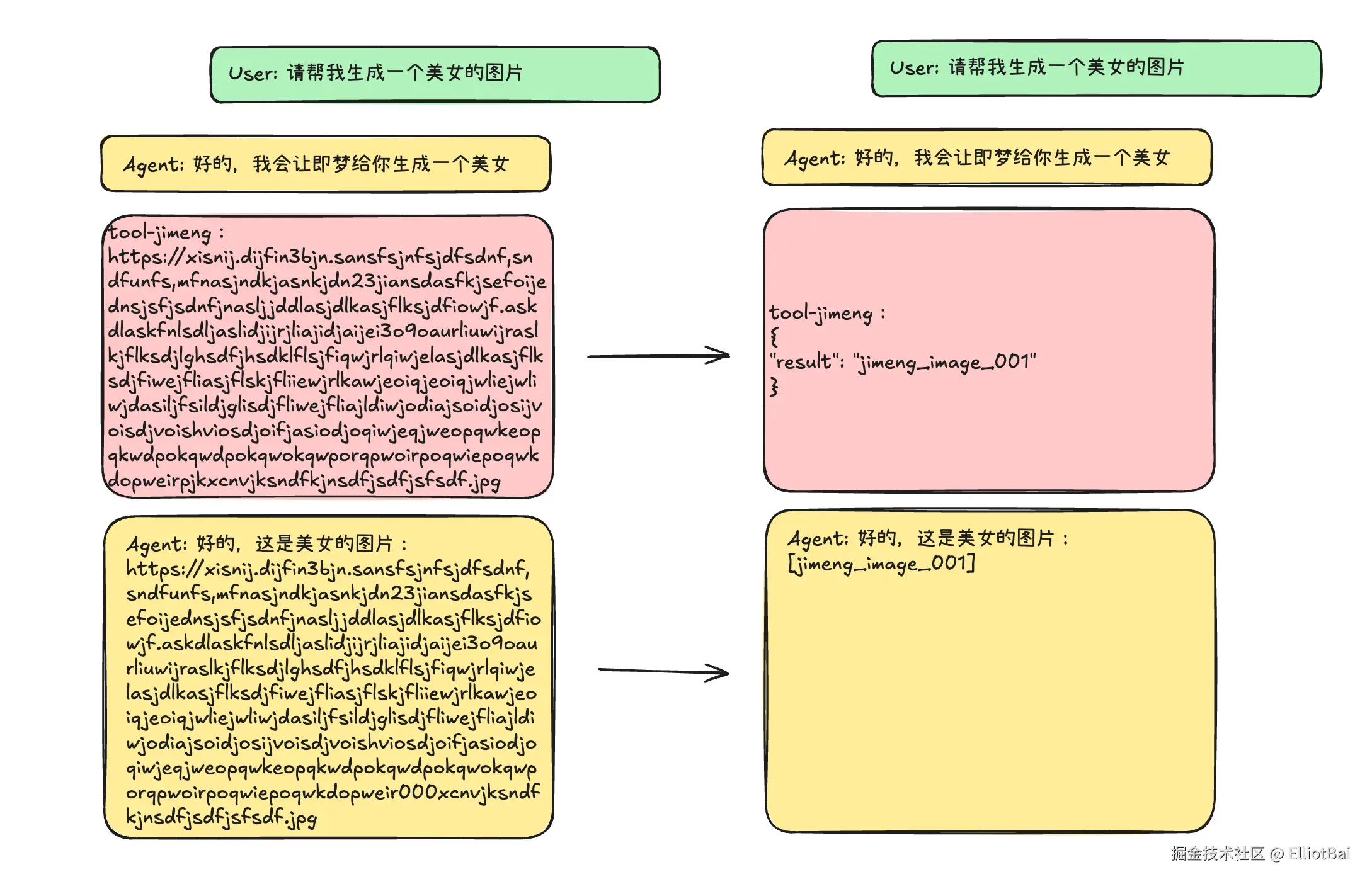 当 Agent 需要调用工具(比如即梦4的图片编辑接口)时,它需要把图片传递给工具。如果用 URL 方案,模型就得生成一个完整的签名 URL。