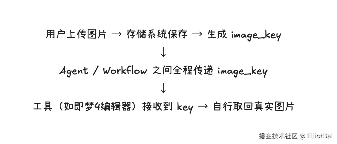当某个工具真正需要处理这张图片时,它根据 key 去存储系统里取回真实图片即可。