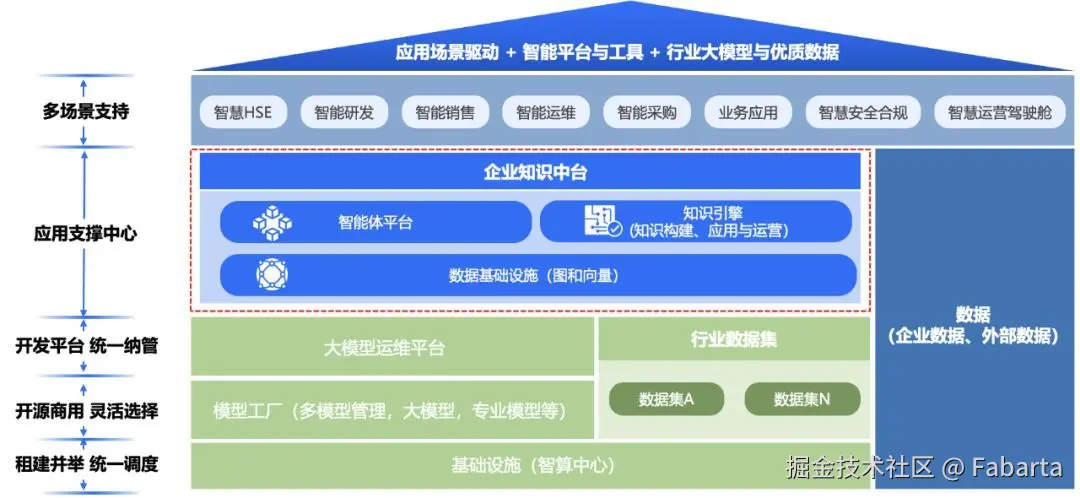 那大模型落地都包含哪些主要部分?下图是我们根据实践给出的企业落地参考架构。