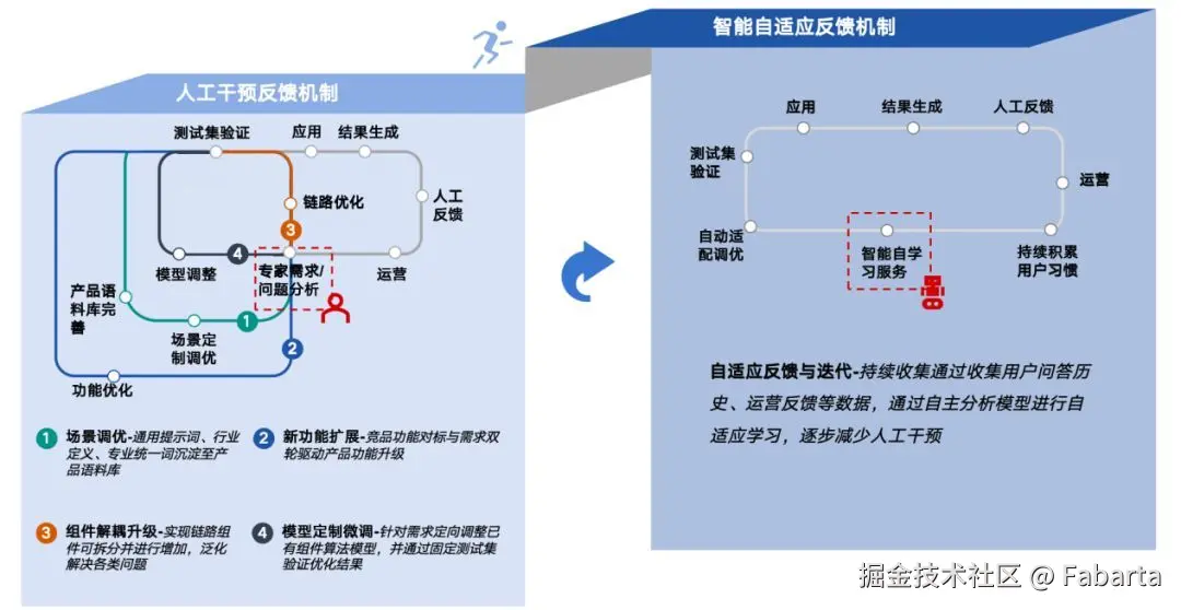 在场景落地后,也需要通过持续优化的方式来进行迭代和完善,不同部门协作,通过收集人工反馈,针对反馈进行场景调优、新增功能、功能解耦升级以及模型定制微调方式实现闭环反馈;同时随着经验的积累和能力提升,进而转向智能自适应反馈机制,在运营中持续提升效果。