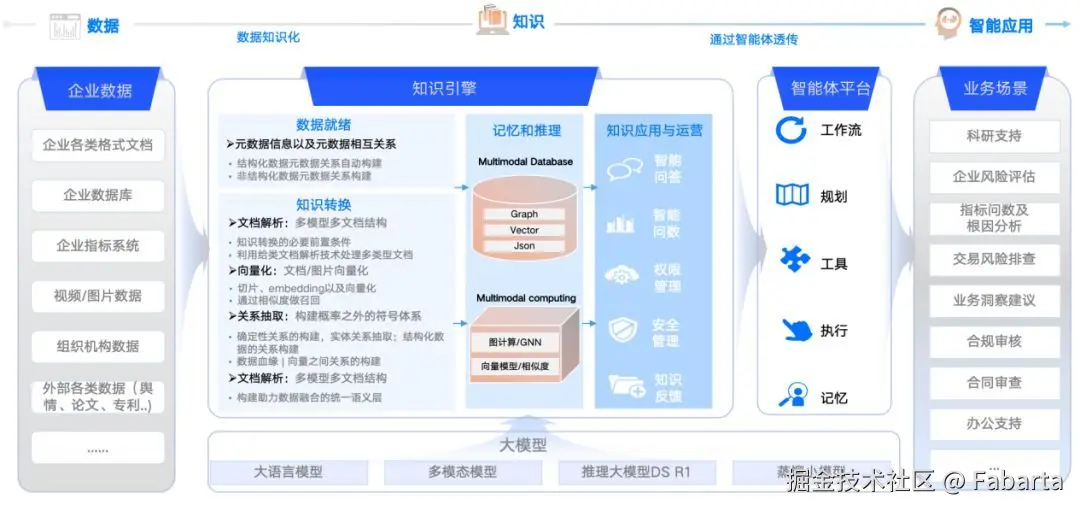 整个流程本质上是从数据到知识再到智能应用的转化过程。输入是企业内部的多模态源数据,包括企业内部存储在关系型数据库、指标系统里的各类结构化数据、文档/图片/音频/视频等各类非结构化数据,以及外部的各类舆情/新闻报道/论文/专利等各类数据。而输出则是赋能企业业务的场景应用。中间是核心处理流程,通过知识引擎对源数据的预处理、数据解析向量化、实体及关系抽取等技术将各种多模态数据转换为知识,再存储到图和向量融合的多模态引擎中作为构建应用的知识储备,包括以实现文档问答、智能问数、图谱应用等基础知识应用。最终再结合具体业务流程,通过智能体平台串联,结合知识应用,进而实现对于各个场景的支持。在整个落地流程中,结合客户的多模态数据,基于知识引擎和智能体平台进行落地,我们称之为以数据为中心的大模型落地范式。