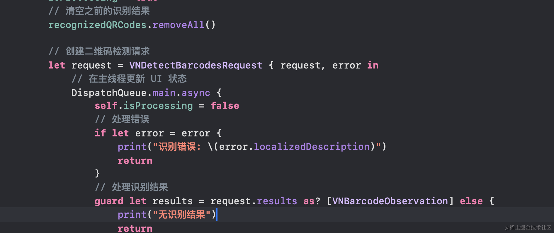 guard let results = request.results as? [VNBarcodeObservation] else { return }
