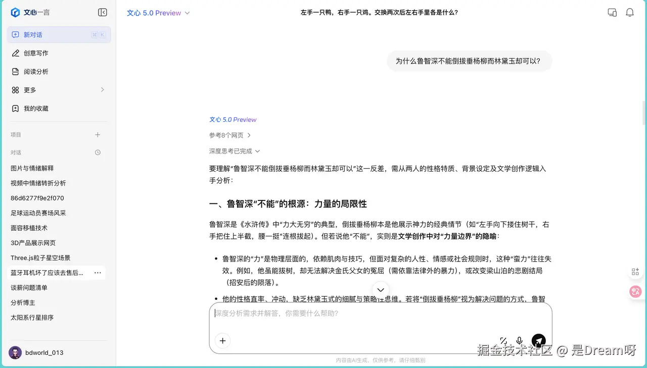 它从两人的性格特质和文学背景切入,指出鲁智深的"力"是物理层面的蛮力,面对复杂的人性、情感或社会规则时往往失效。而林黛玉是精神层面的,跳出了表层的文字游戏,从文学范式的对比中挖掘出了更深的内涵。虽然日常使用不太会遇到这种问题,但这个测试展现了文心5.0在文本抽象思维和深度洞察方面的能力。