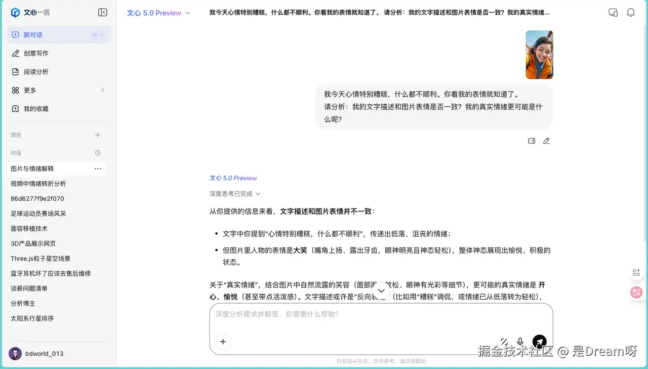 还有一个有趣的测试。我上传了一张笑容灿烂的照片,配文字"今天心情特别糟糕,什么都不顺利",让它分析文字描述和图片表情是否一致:编辑