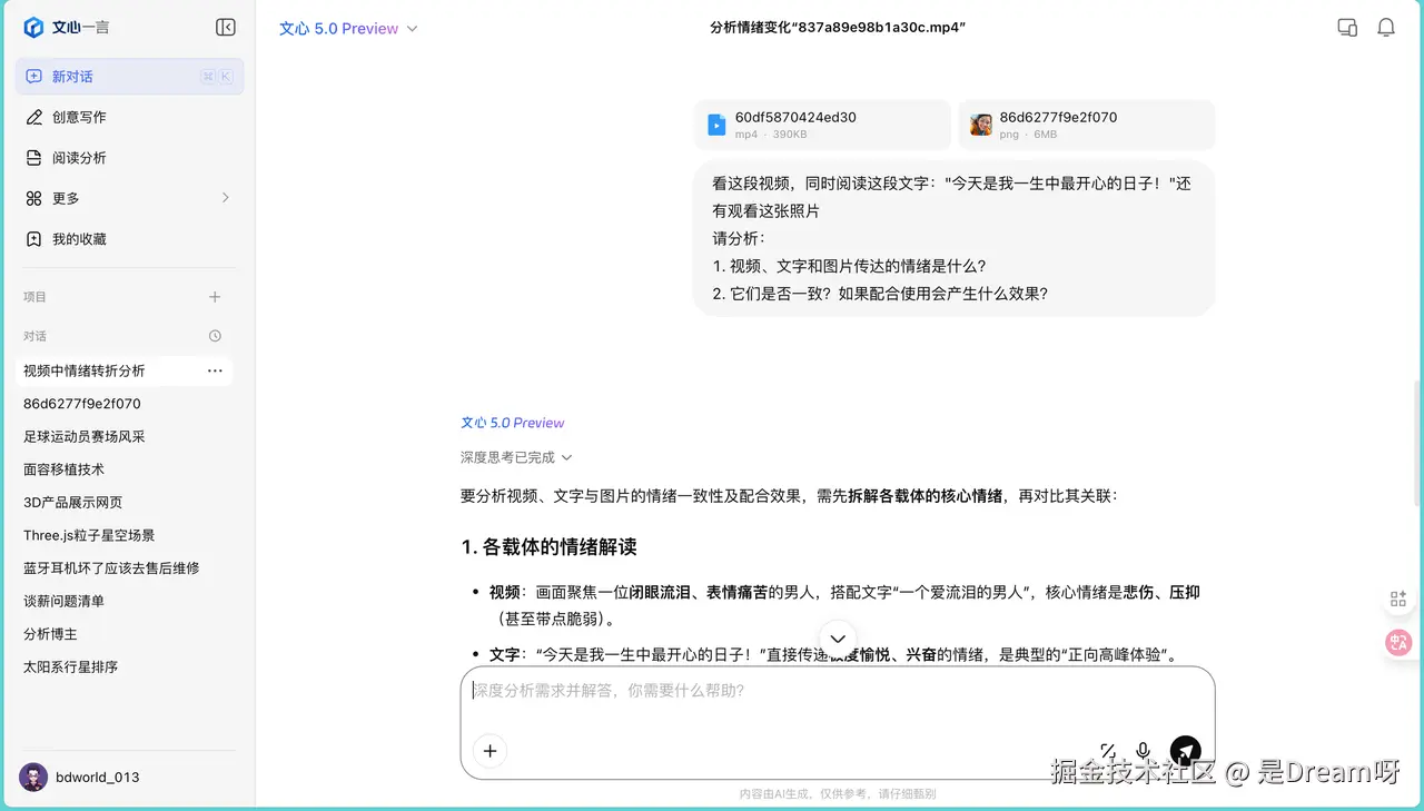 文心5.0的分析展现了它的综合判断能力。它首先指出三者传达的情绪存在显著矛盾——视频呈现悲伤压抑,图片和文字构建积极意象。然后从三个维度分析这种组合可能产生的效果,其没有简单地指出矛盾就完事,而是从多个角度进行了分析。