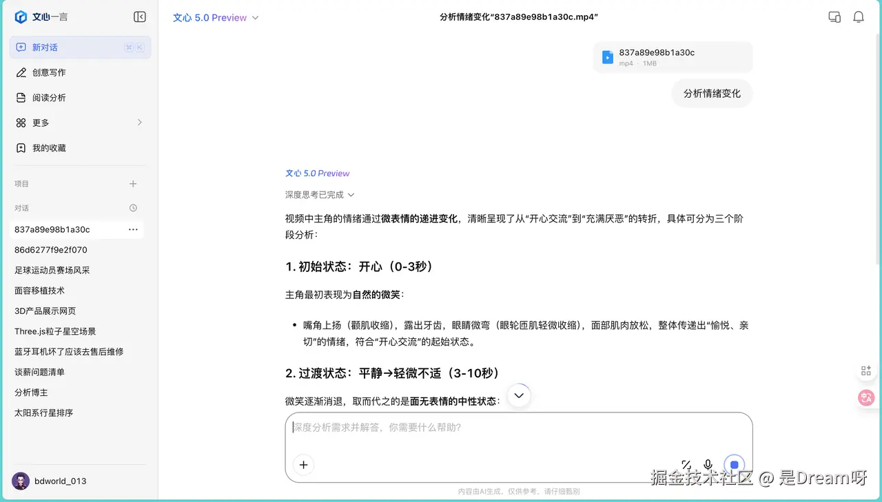 在情绪识别测试中,我上传了一段面部表情变化的视频,让它分析情绪变化过程: