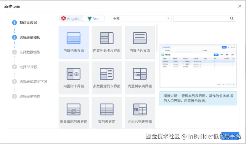 按照表单创建向导创建页面,在【选择表单模板】时切换页面类型为【Vue】,此时向导中显示可用的Vue页面模板,我们可以根据业务需要选择对应的页面模板。选择完成后点击『下一步』,按向导提示完成Vue表单创建。