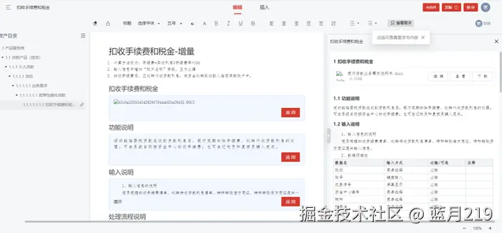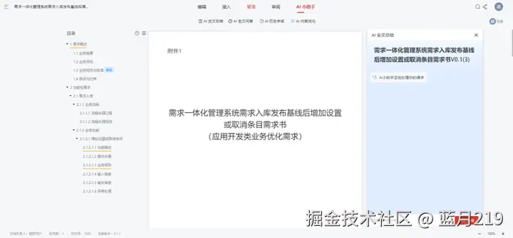 AI 全文总结:文档编写完成后,AI 自动提炼核心内容,生成 “100 字以内摘要 + 关键功能清单”,帮助快速把握文档重点,尤其适用于长文档(如 50 页以上的系统需求说明书);