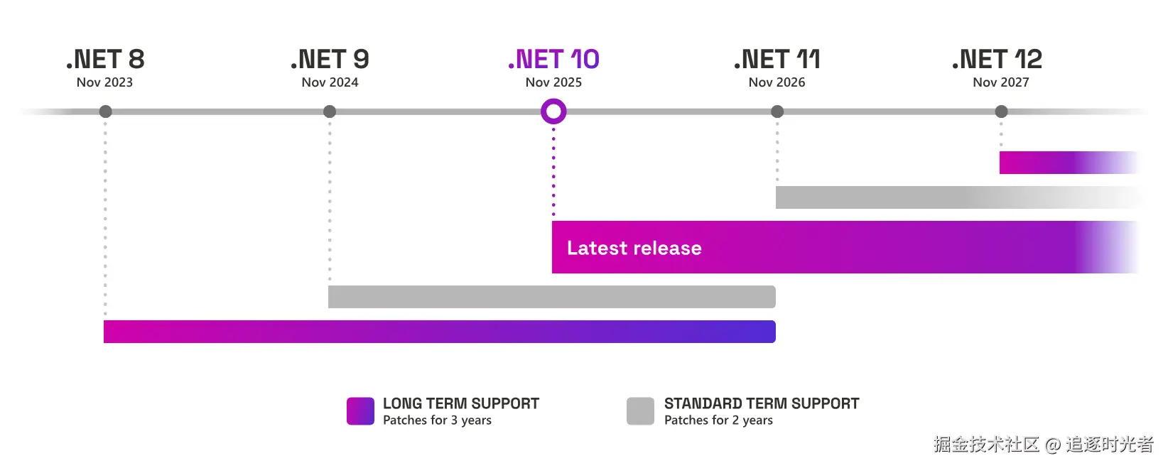 .NET 10 是一个长期支持版本(LTS) ,将支持三年 ,直至 2028 年 11 月 10 日。我们强烈建议生产环境中的应用程序升级到 .NET 10,以便享受更长的支持周期、显著的性能提升以及众多新功能。