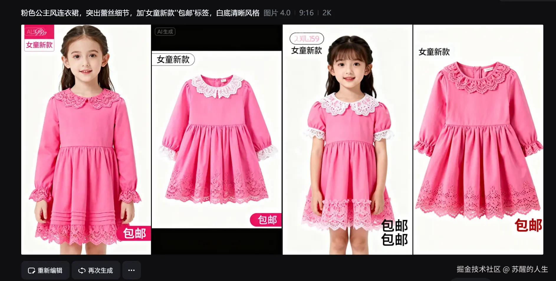 最后实测的即梦AI,完全颠覆了对AI生图工具的认知。以"童装连衣裙主图"为例,打开即梦AI,直接用大白话输入需求:"粉色公主风连衣裙,突出蕾丝细节,加'女童新款''包邮'标签,白底清晰风格",点击生成,不到2秒就出了4张不同排版的主图供选择。