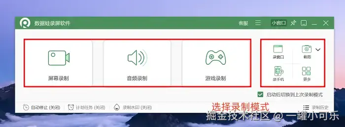 步骤1:如何电脑录屏?在官网下载好数据 蛙录屏软件,点击打开。进入软件的第一个页面后,就可以按照你的录制需求选择录制模式了。今天我们先来详细讲一下 “屏幕录制” 这个模式。