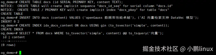 INSERT INTO docs (content) VALUES ('openGauss 数据库性能卓越'), ('AI 向量检索支持 DataVec 模型');