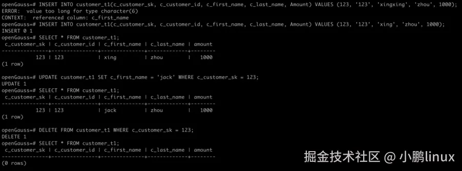 验证小结:openGauss 基础的 SQL 能力兼容性良好,且具备标准的关系型数据库的严格数据类型检查(如字符长度检查),表现稳定可靠。