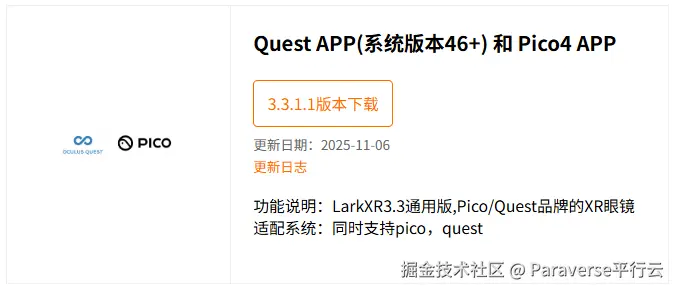 LarkXR客户端迎来重大升级,首款通用版**VR APP上线,同时适配PICO和Quest的多款VR一体机眼镜。