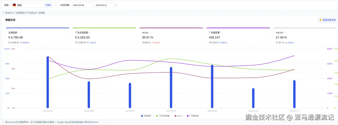 看着步骤简单,人工落地全是坑:长尾词根本没精力一个个挖,潜在好词全漏;每天只能看1次数据,调价慢半拍,竞品一发力就丢流量;按梯队建广告组要耗几小时,最后只能乱堆,优质词被废词拖垮。4月初数据就是教训——销售额才6k+欧元,ACOS却飙到33%,明明知道方法,就是干不动。