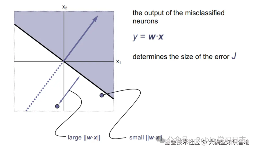 于是我们通过输入向量x和权重向量w(即超平面法向量)的点积,定义误差 J