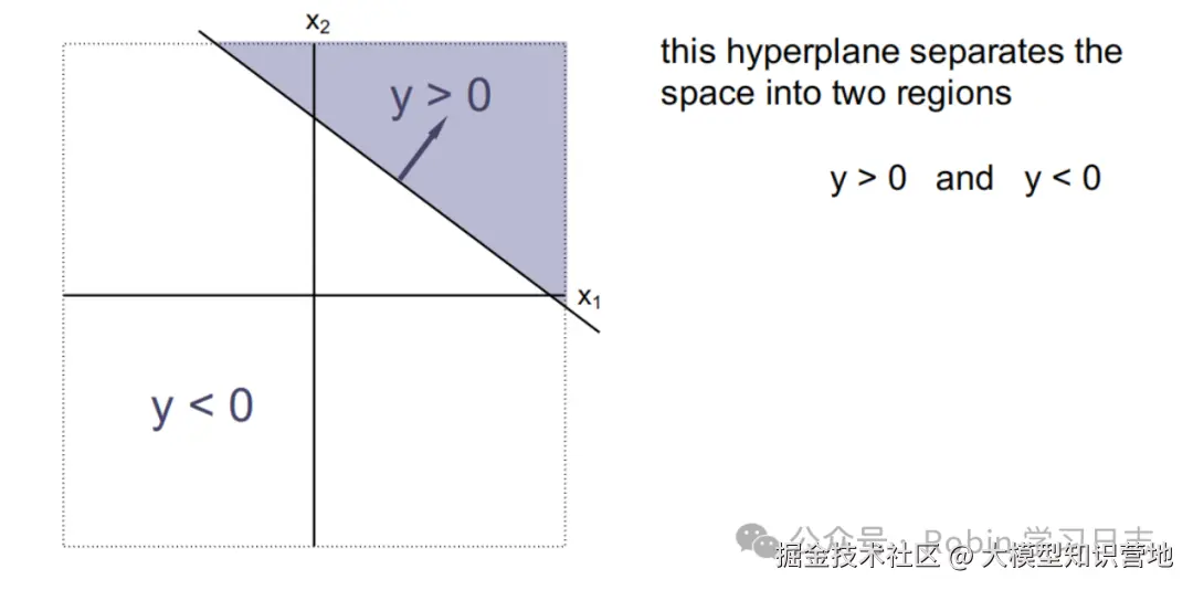 输入向量 x 可视为多维空间中的一个点,权重向量 w 定义了一个超平面hyperplane(分类边界)