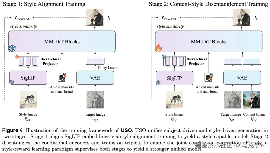 第一阶段进行风格对齐训练,将SigLIP提取的多层风格特征对齐到文本空间,使模型获得风格迁移能力。第二阶段引入VAE内容特征,基于三元组数据进行风格-内容解耦训练,增强模型的语义理解能力。