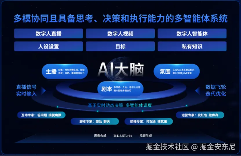 在实际直播间中,这种能力进一步被扩展为多智能体协同。数字人的“AI 大脑”会根据直播热度、观众行为、评论节奏不断做出判断,并调度不同智能体执行任务:直播冷场时调度助播智能体活跃气氛,用户进入犹豫期时调度运营智能体发券,出现专业提问时调度互动智能体回答。