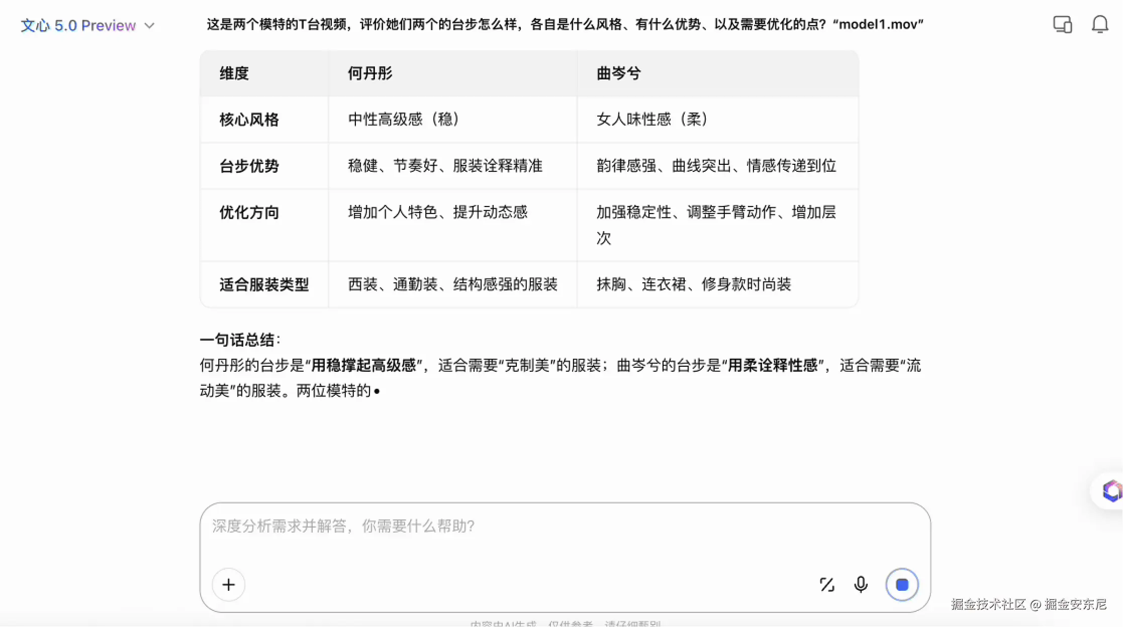 例如它会指出:“左侧模特的步频更稳定、步幅更小,节奏感偏向常规走秀”,“右侧模特的步伐更大、摆臂更明显,更偏向视觉冲击型展示。”这是典型的动作韵律理解,不是画面级别的“识别”。