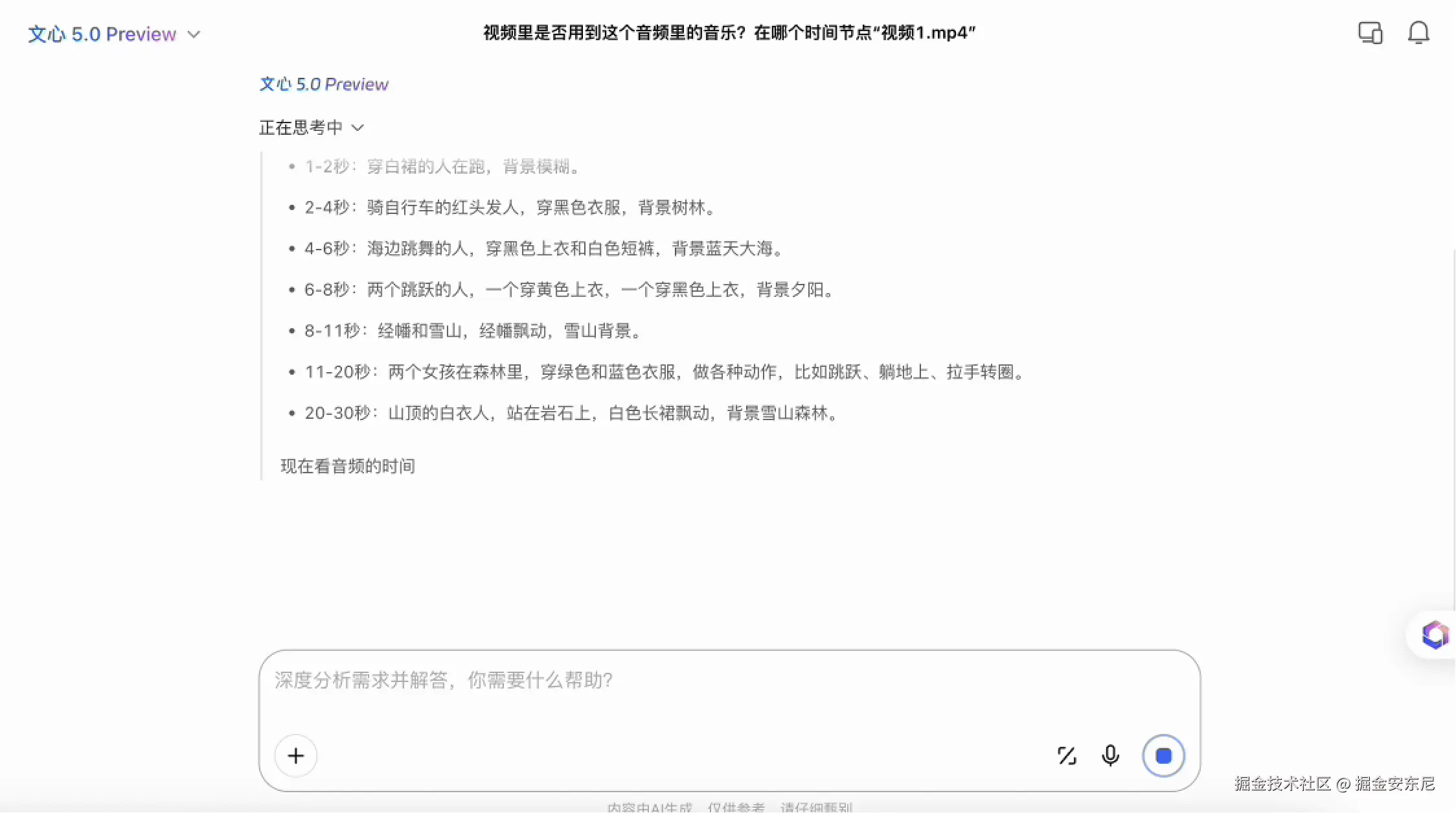文心 5.0 会同时读取视频帧的动作节奏、背景音轨的波形特征、音乐的节拍与旋律变化,再把这些特征放在同一空间做比对。于是当音乐真正被用在视频中时,模型能够捕捉到音轨与画面节奏之间的对应关系;它也能指出具体是从哪个时间点开始, 这个能力本质上不依赖“语言描述”,而是依赖原生全模态模型对音频与视频在同一链路上的比对能力。