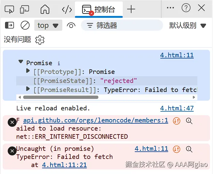 // 5. 如果上面任意一步出错(网络失败、JSON 解析失败等),
