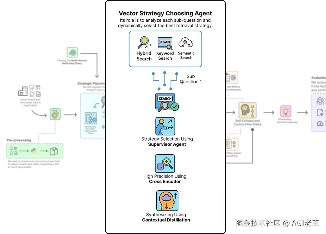 - 检索(Retrieve):对于每个步骤,supervisor会动态选择最佳搜索策略(向量、关键字或混合检索)来执行一个自适应的多阶段检索漏斗。