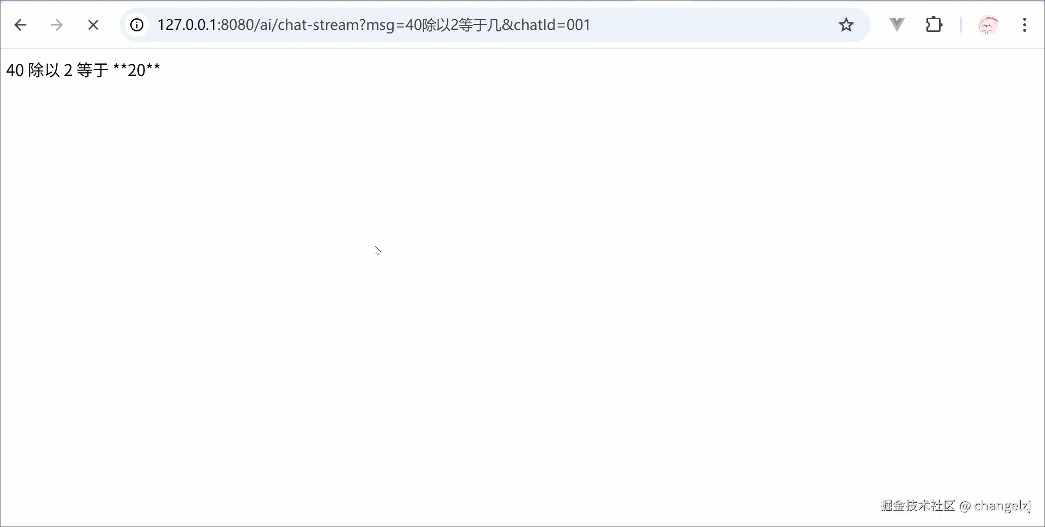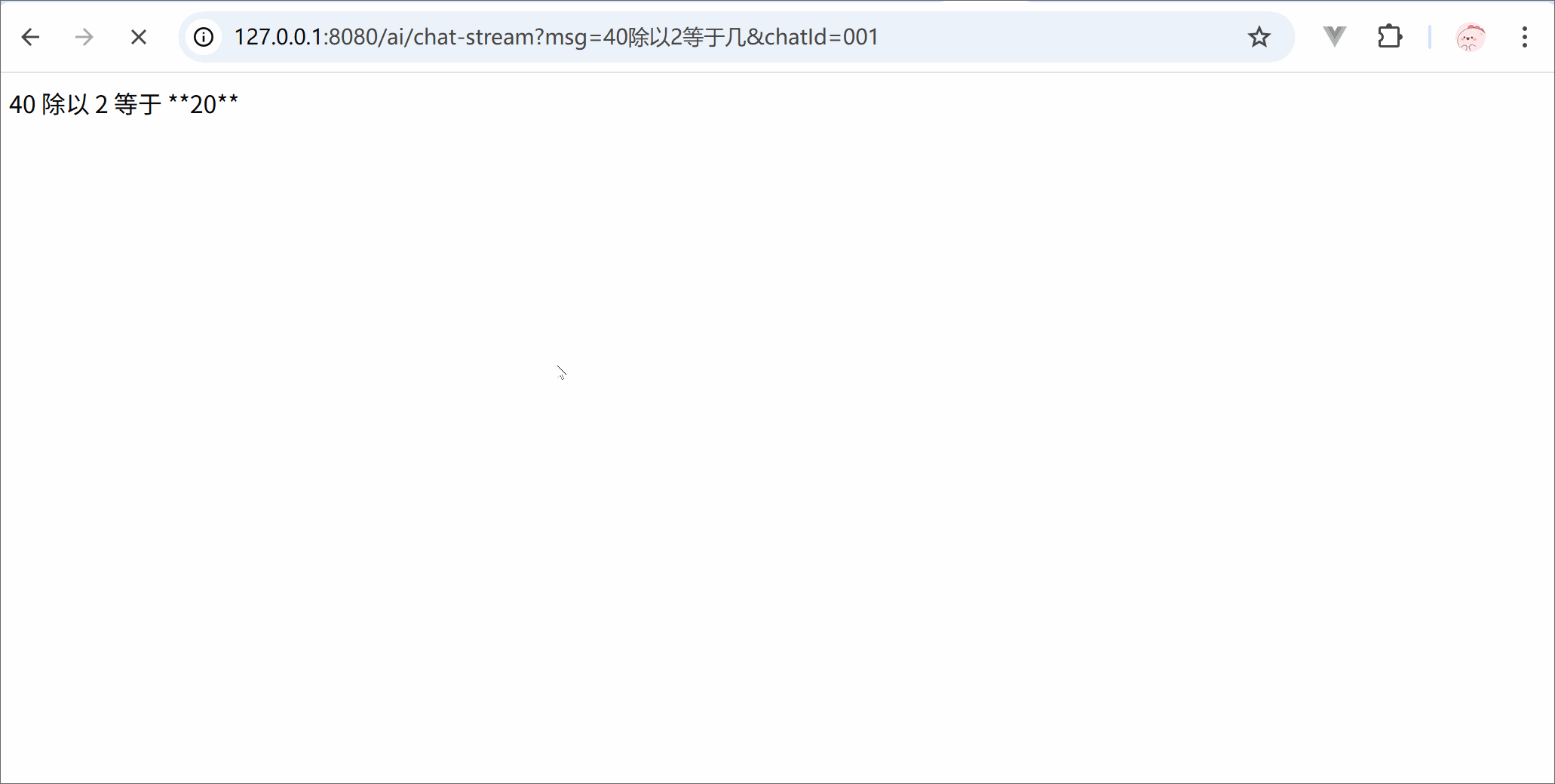 "text" : "40 除以 2 等于 **20**。 \n如果你有其他问题,随时问我哦! 😊"