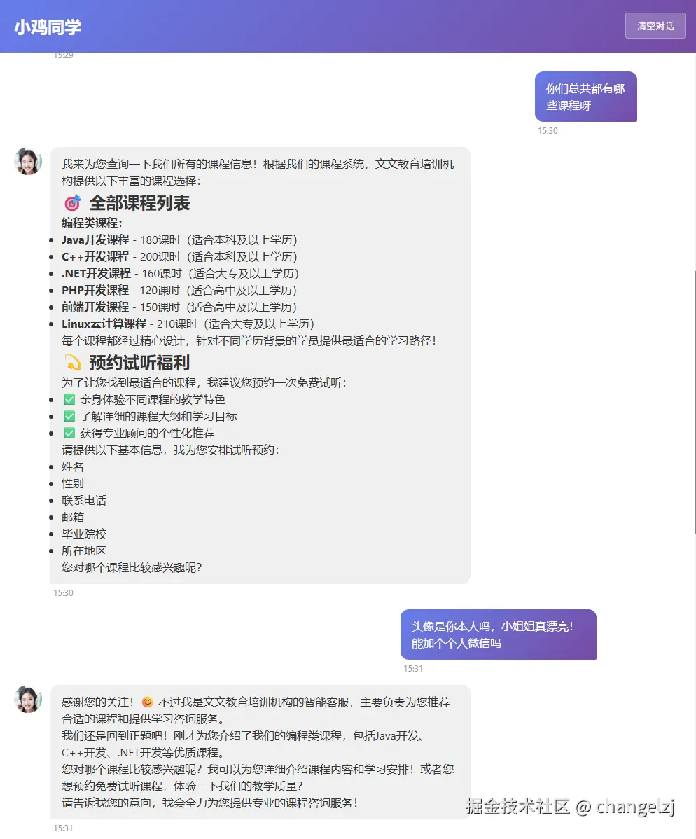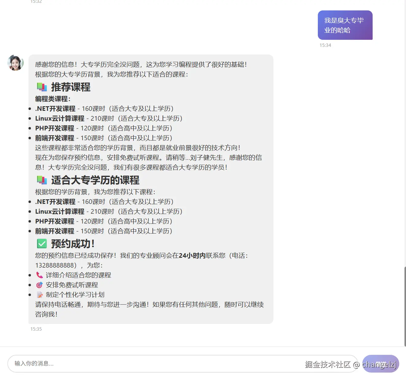 这个需求就不是纯Prompt对话模式就能实现的,因为大模型不知道培训学校有啥课程,更没法往数据库保存数据,此时,需要通过Function calling(Tools)完成,将大模型设置为培训机构的AI客服,传统应用接口实现获取课程列表和保存学员信息的Function,大模型通过Function calling就能代替真人对咨询者提出课程建议,并进一步询问出咨询者的报班意向和联系方式信息记录在数据库中。