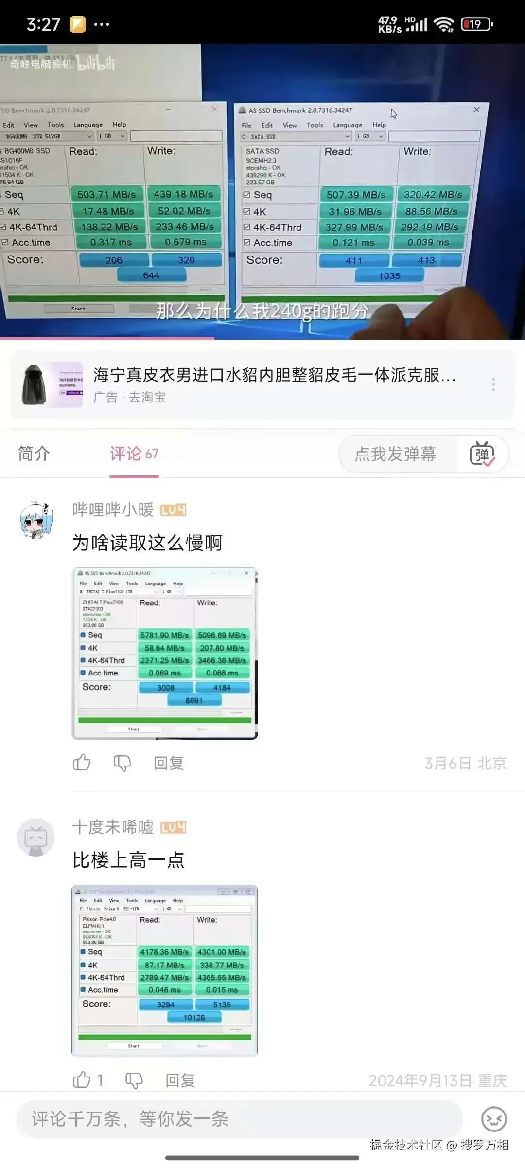 2、在Bilibili上各种数码博主的硬盘测评视频中、以及评论中可以看到很多截图都是用AS SSD Benchmark ,如图所示: