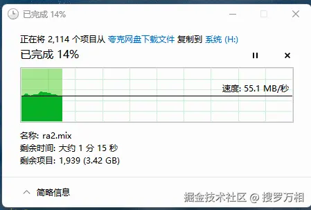 测试一下从F盘复制一堆文件到E盘,这一堆文件大小一共5.13GB