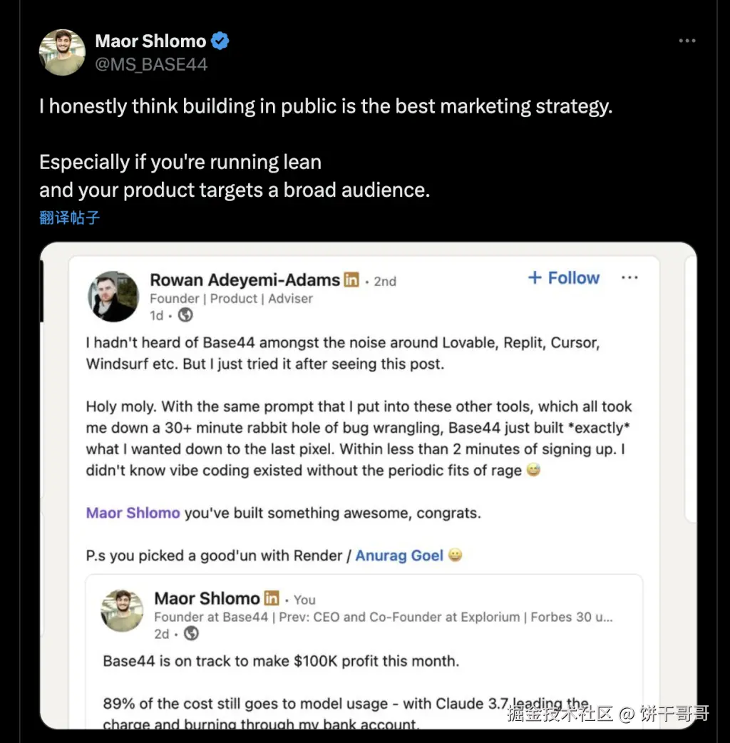 因为创始人清楚自己的目标用户是“不会写代码的小企业主和创业者”,这些群体在LinkedIn上的活跃度更高。将有限的精力聚焦在用户最集中的平台,通过内容分享和个人品牌构建,实现精准触达和高效转化。
