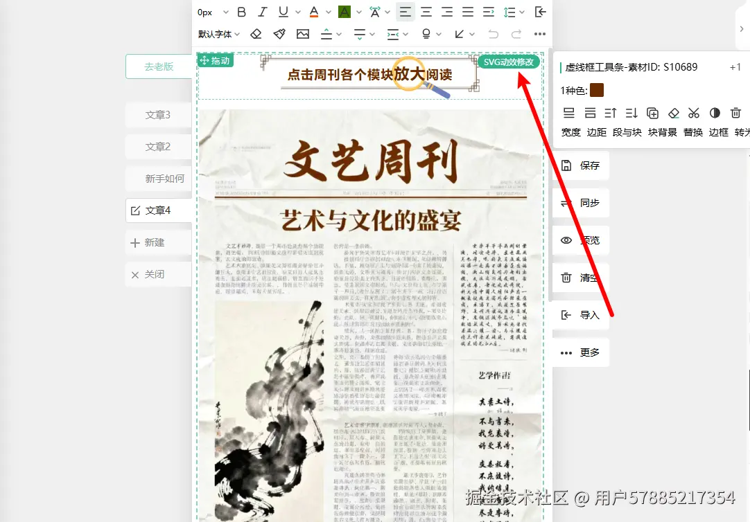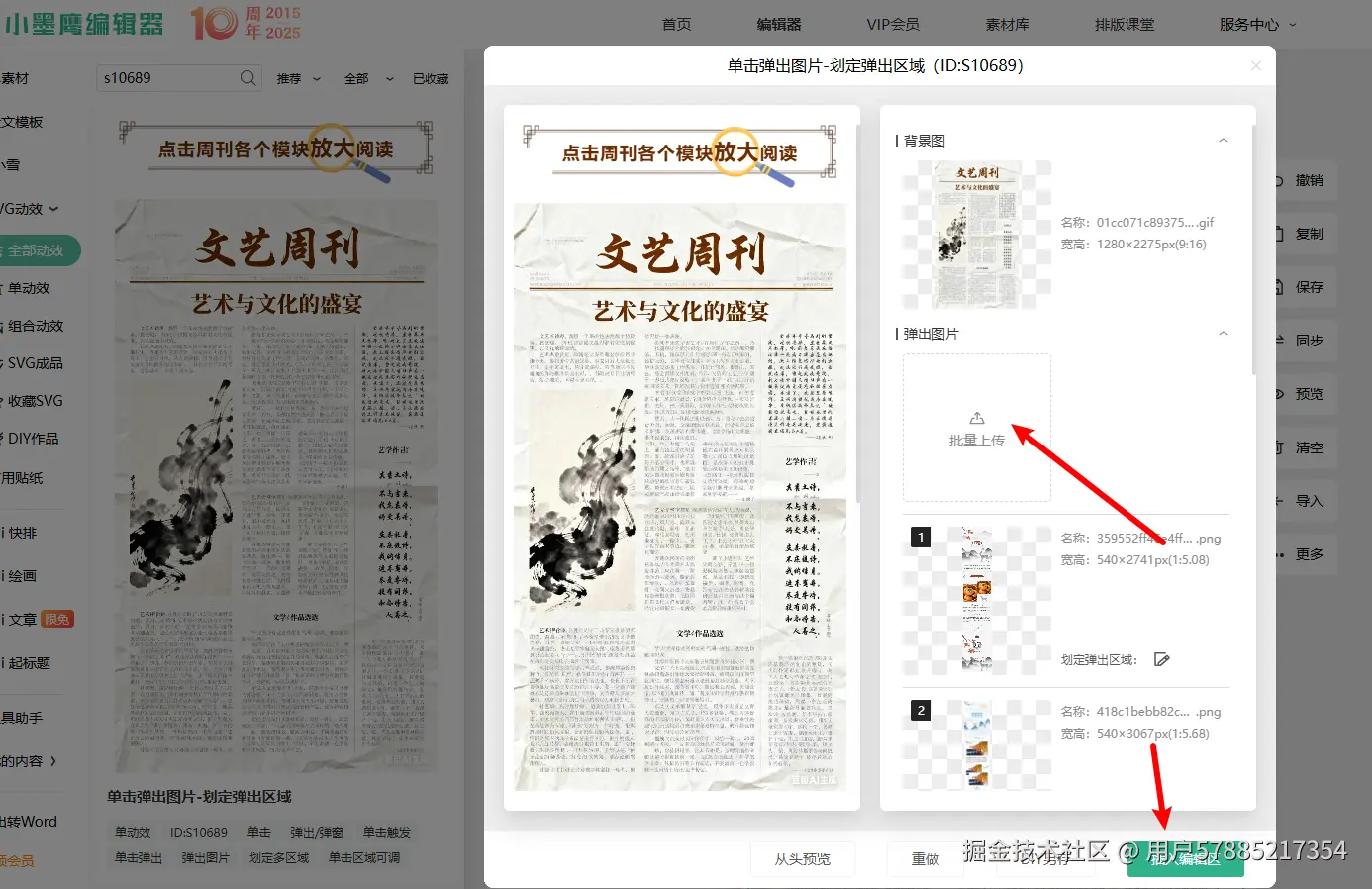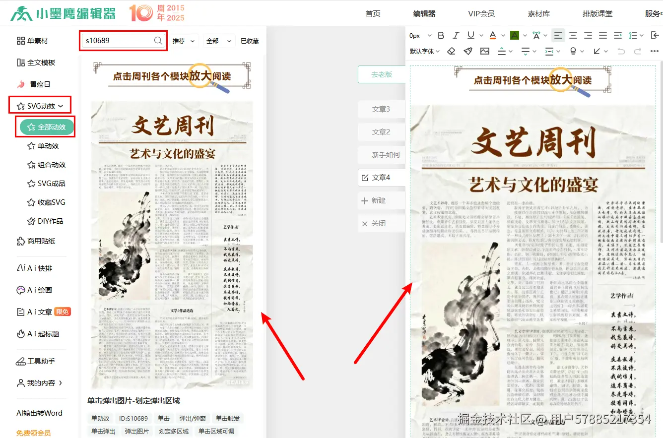公众号文章中如何实现点击不同区域弹出不同长图内容? 用户57885217354 2025-11-15 74 阅读1分钟 在我们编辑公众号文章的过程中,有时候内容过多但文章中却放不了太多的文字,这时我们可以使用点击图片的不同位置可以放大阅读,或者说是弹出不同的长图供人观看,那么这种效果如何实现呢?一起来看下吧 ! 首先我们打开小墨鹰编辑器,依次点击左侧的SVG动效-全部动效,并在搜索框中进行搜索ID:s10689,点击即可进行使用; 点击素材然后点击右上角的SVG动效修改,即可更换为自己的内容; 以上步骤完成后同步到微信公众号后台便可以实现点击不同位置可以放大阅读的效果了!