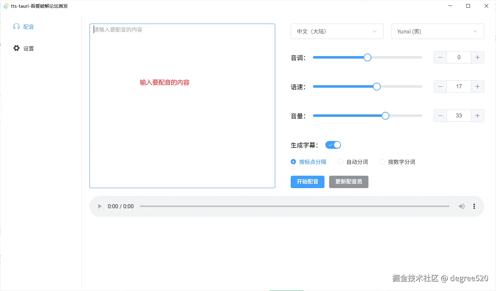 - 开始配音:点击“开始”,几秒即可输出高质量音频,同时自动生成同步字幕文件,方便直接导入剪辑软件。
