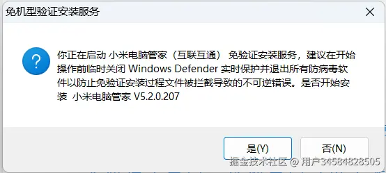 开始安装的时候会有一个「免机型验证安装服务」的弹窗,提醒你关闭 Windows Defender 实时保护以及暂时退出防病毒软件。
