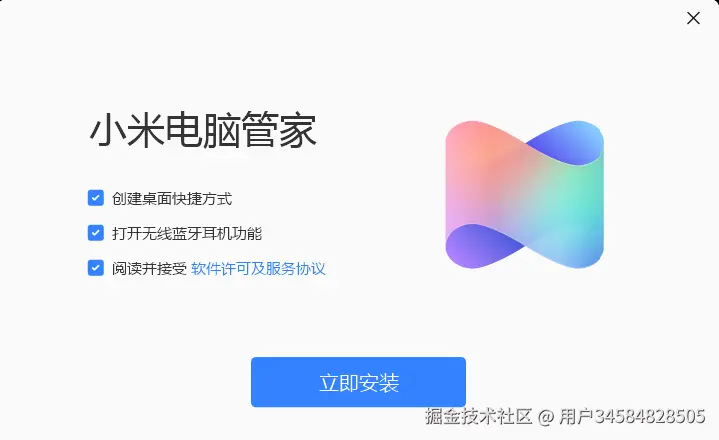 双击运行「免机型验证-小米电脑管家.exe」,勾选“阅读并安装软件许可协议”,然后点击下面的「立即安装」。