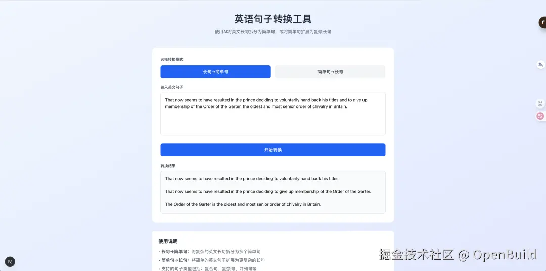 在有工作流的指导下,用 Vibe Coding 完成了一个简单的英语学习网站,其中需要使用到一些 AI 工具的 api,在开发过程中也有详细的指导步骤,完成起来还是比较顺利的。