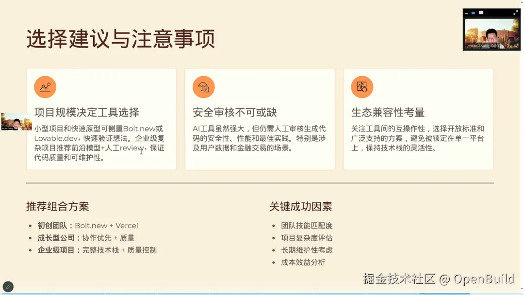 第二课的工具链与工作流教学,张晋涛老师详细拆解了 Vibe Coding 常用的编码工具,不仅讲解了工具的基础操作,更结合具体使用场景、技术栈等分析了各种AI工具。