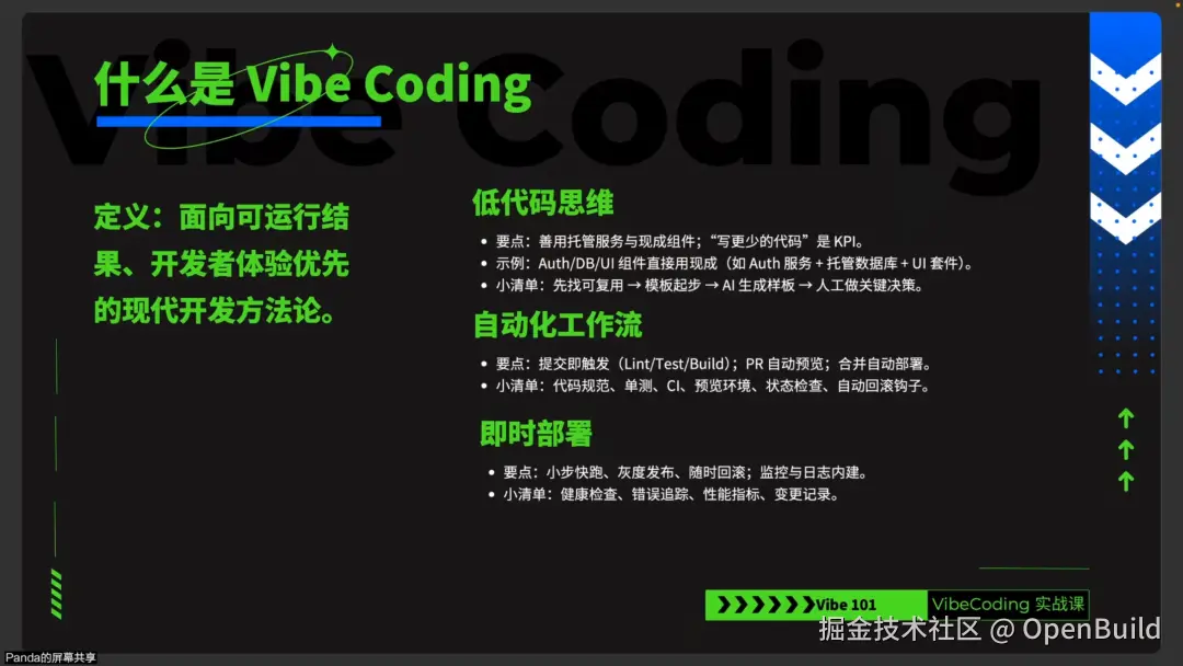 第一课的基础认知环节,是我走进 Vibe Coding 世界的起点。Cell 细胞、张晋涛等五位导师毫无保留地分享了各自在开发中的宝贵经验 —— 小到日常编码的避坑技巧,大到长期深耕领域的思维方式,这些 “过来人” 的心得远比单纯的理论更有冲击力。我第一次意识到,Vibe Coding 不止是一种技术方法,更是一种 “轻量化、高效率” 的开发思维,也为后续的学习打下了认知基础。