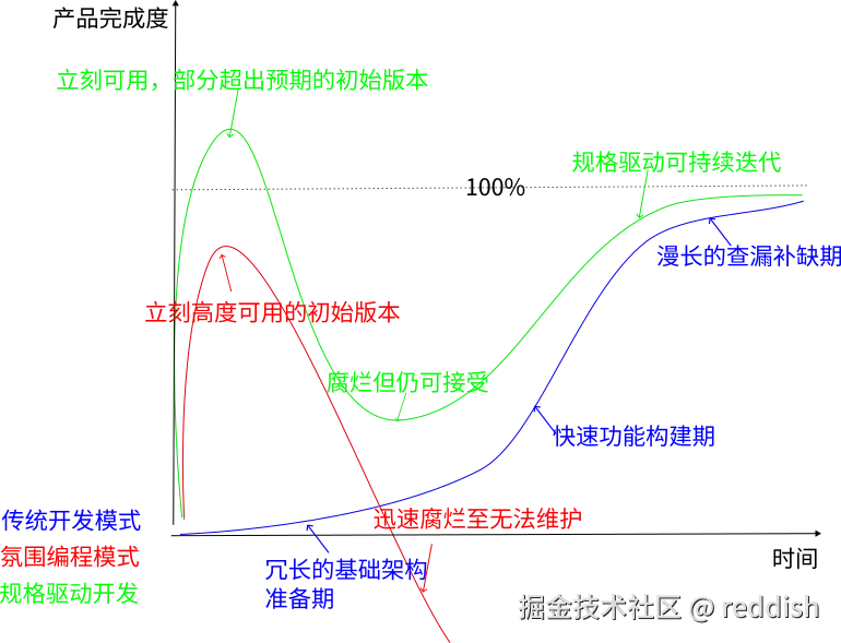 传统编程就像爬山,前期累死累活,慢慢往上爬,后期还得不停维护。但氛围编程和规格驱动开发就不一样了,一上来就能给你个惊喜,进展飞快。这也难怪那么多人相信"有想法就够了,剩下的交给AI"。