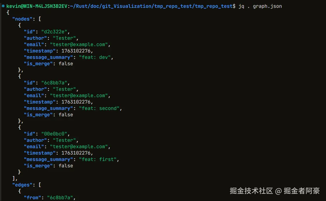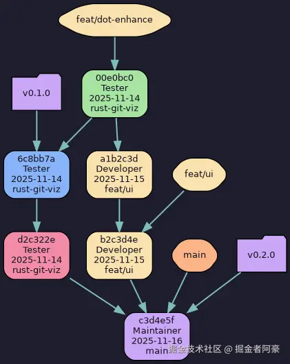 通过 git rev-list --topo-order --date-order --parents,我们获得了既符合时间顺序又保持拓扑关系的提交列表。这个命令的输出格式是:child_hash parent1_hash parent2_hash ...,正好符合我们构建有向图的需求。