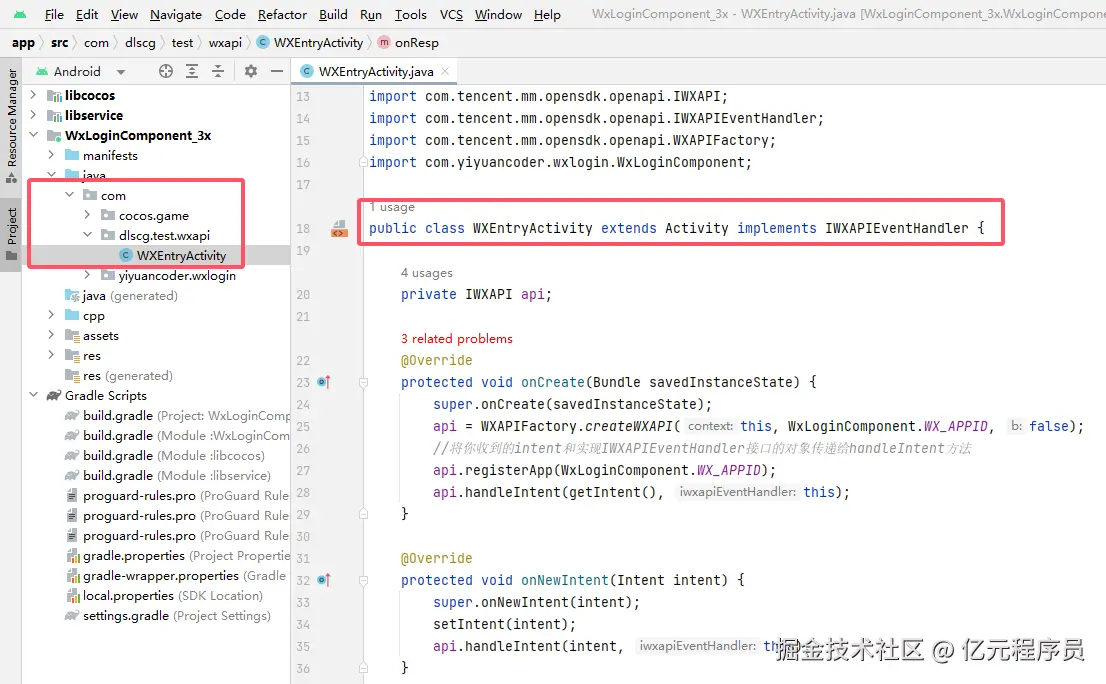 在包名com.dlscg.test(自己游戏的包名,没有则创建)下创建一个文件夹wxapi并且创建一个Activity实现IWXAPIEventHandler接口用于接收微信登录的回调。