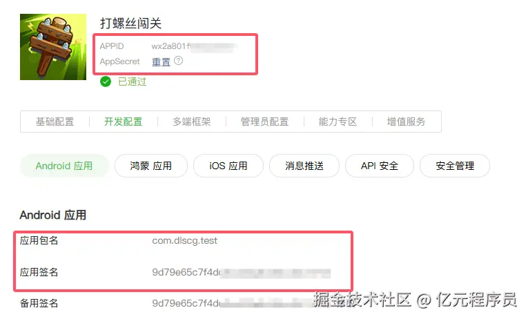 填好之后可以提交审核,审核成功后即可获得微信登录权限,获取APPID和AppSecret,配置包名和签名。签名的获取可以通过官方提供的工具。