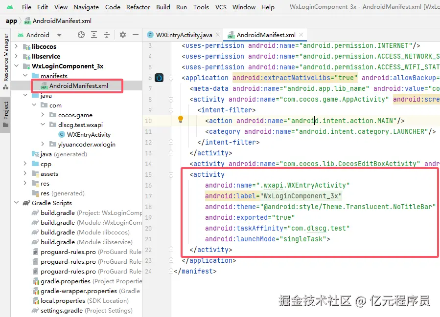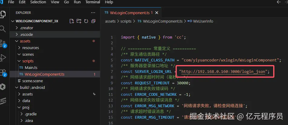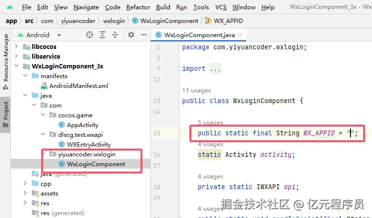 创建WxLoginComponent用于与Cocos交互,填写好自己游戏的WX_APPID。